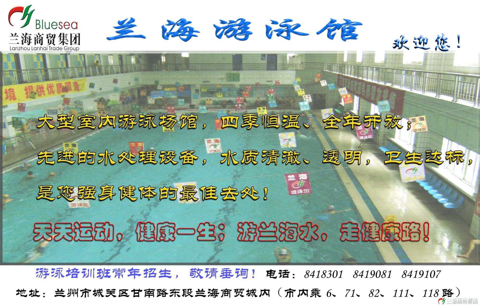 蘭海游泳館隸屬于甘肅蘭海商貿集團有限公司,位于甘南路東段蘭海商貿城院內,是一座專門進行游泳健身的室內場館。我館是蘭州市為數不多的全年對外開放的游泳場館,營業時間從早7點~晚9點,方便您隨時來館鍛煉;交通方便,市內乘6、71、82、111、118、130路車均可到達;收費合理,屬于大眾游泳健身場館,讓廣大工薪階層也能享受健康的游泳運動。